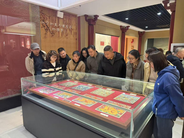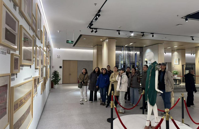 活动伊始,在博物馆讲解员的引导下,大家首先走进云锦艺术陈列展厅,展区内着重展示了云锦大花楼木织机的生产场景、历代丝绸文物复制精品以及云锦妆花各类花色品种,时间跨度从战国绵延至明清再到现代,既有宫廷御用的华美匹料与衣冠,也有民间流传的精巧织物,一幅幅图文展板、一件件珍贵实物,生动诠释了云锦“寸锦寸金”的内涵,大家不时驻足凝视,认真聆听讲解,对云锦在材质、纹样、织造工艺上的独特之处赞叹不已。