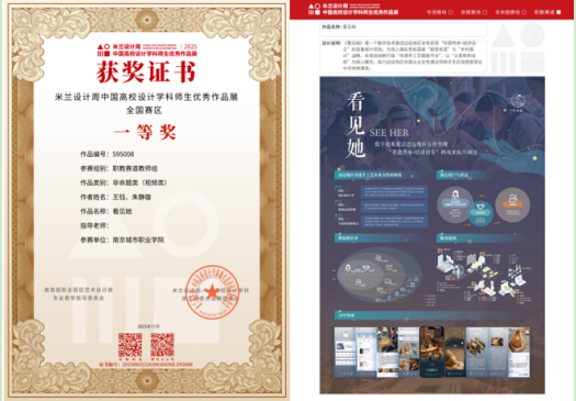 近日,我校数字文创学院王钰和朱静璇两位老师合作完成的设计作品《看见她》,立足“脱贫攻坚”与“乡村振兴”时代命题,体现了设计介入社会发展的创新思考与实践关怀。荣获2025年第九届“米兰设计周—中国高校设计学科师生优秀作品展”职教赛道教师组全国赛区一等奖。