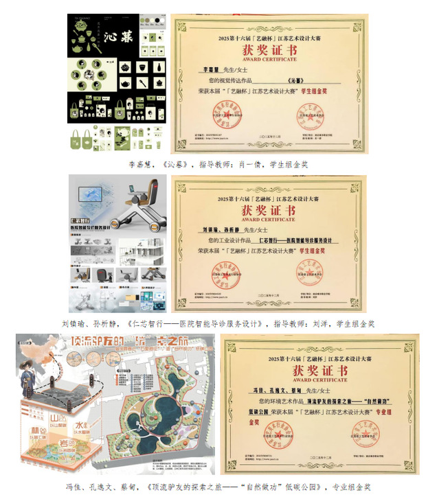 2025年12月21日,由江苏省工艺美术行业协会、江苏省工艺美术学会主办的第十六届“艺融杯”江苏艺术设计大赛评选结果正式揭晓。本届大赛作为江苏省高等教育学会认定的省级重要学科竞赛,共吸引全省高校提交作品3598件,竞争异常激烈。我校数字文创学院师生团队凭借卓越的专业素养与创新设计能力,在众多参赛者中脱颖而出,斩获多项大奖。
