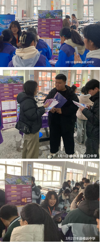 为进一步扩大我校办学影响力,吸引更多优质生源,数字文创学院刘洋、赵龙梅两位老师于2月28日赴徐州丰县,开展2026年高职提前招生宣传咨询活动。3月1日至2日,两位老师先后走进欢口中学、顺河中学、修远中学,为三校高三学子提供面对面招生咨询服务。